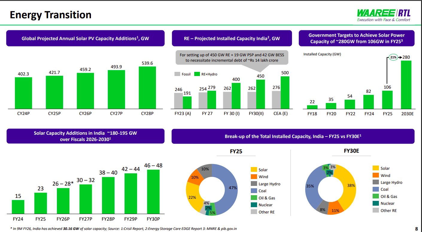 India and global solar capacity additions are set to accelerate sharply, with India targeting ~280 GW of solar capacity by 2030. Solar is expected to take a much larger share of the energy mix, supported by sustained annual additions and long-term renewable targets.
