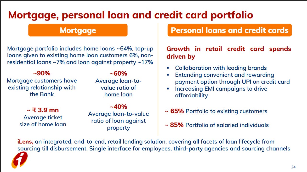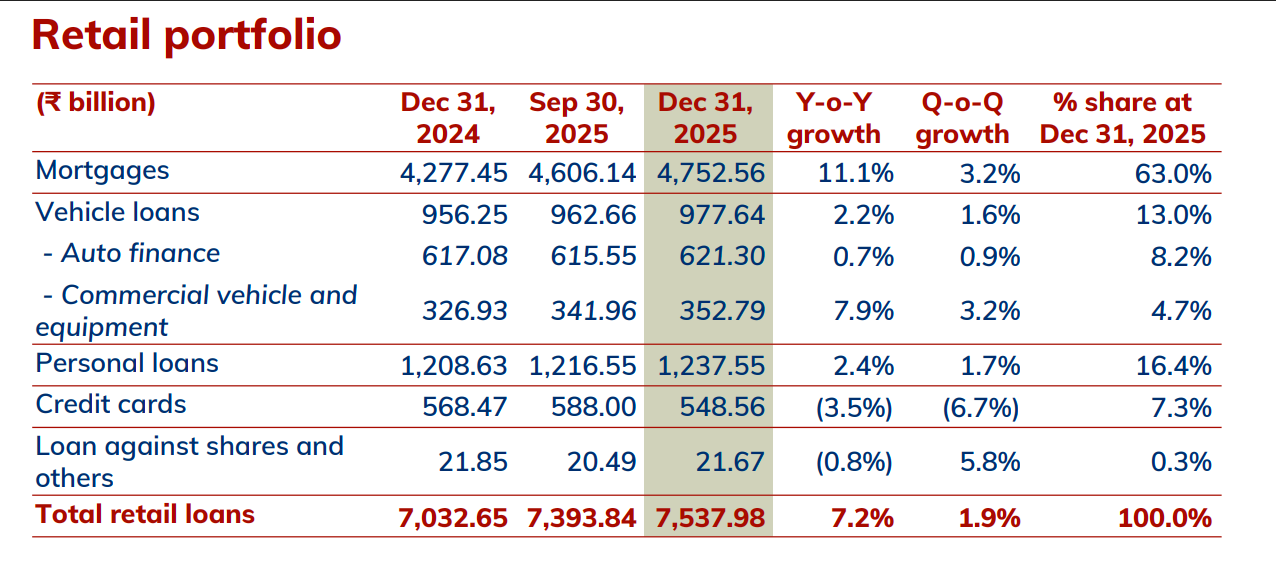 The retail book is anchored by mortgages, which form ~64% of the portfolio, with conservative LTVs and strong existing-customer relationships. Personal loans and credit cards focus on salaried customers, with growth driven by partnerships, UPI-linked payments, and EMI-led affordability.