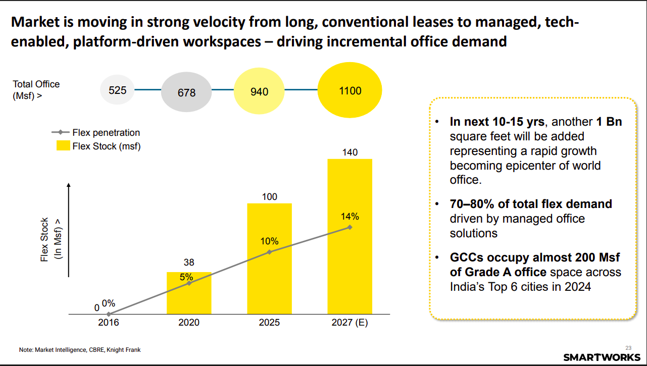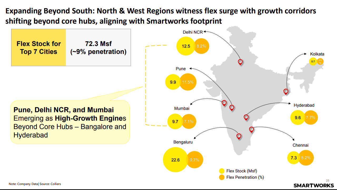 Flex office growth is expanding beyond Bengaluru and Hyderabad into Pune, Delhi NCR, and Mumbai, which are emerging as high-growth engines. With ~72.3 msf of flex stock across the top 7 cities, penetration remains low (~9%), leaving significant headroom for expansion aligned with Smartworks’ footprint.