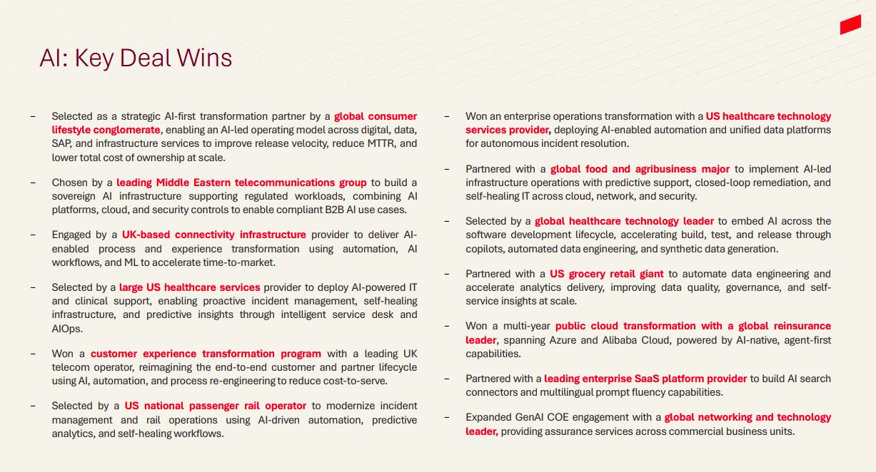 The company continues to see strong AI-led deal momentum across industries, winning large-scale transformation programs with global leaders in consumer, telecom, healthcare, retail, food & agribusiness, and cloud services. These wins span AI-first operating models, AIOps, data engineering, autonomous infrastructure, and GenAI-led development, strengthening long-term strategic relevance.