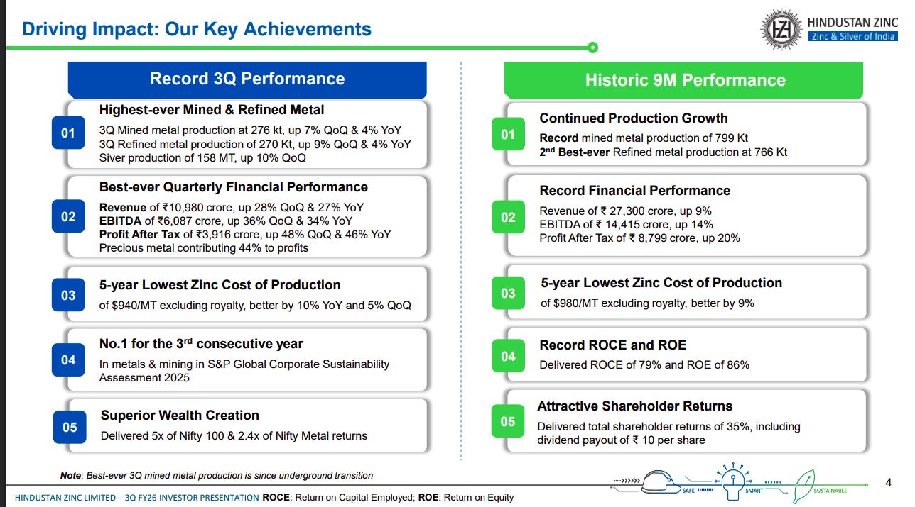 HZL delivered a record-breaking 3Q with highest-ever mined and refined metal output, alongside its best quarterly financial performance. Strong cost control led to 5-year lowest zinc cost, while superior ROCE, ROE, and shareholder returns reinforced value creation.