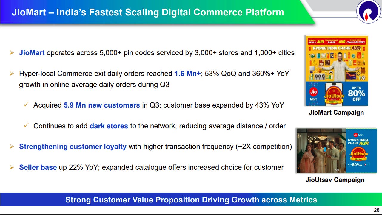 JioMart continued to scale rapidly, operating across 5,000+ pin codes and 1,000+ cities, with daily orders crossing 1.6 million in Q3. Customer additions remained strong, loyalty improved, and expansion of dark stores supported higher frequency and faster deliveries.