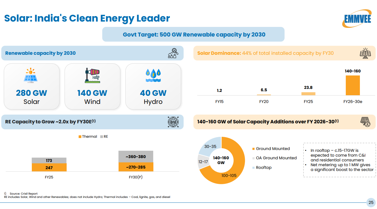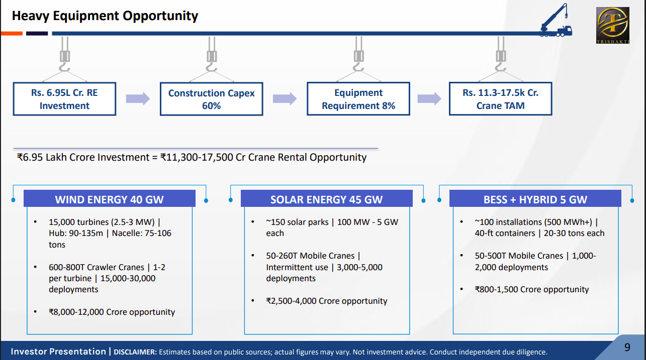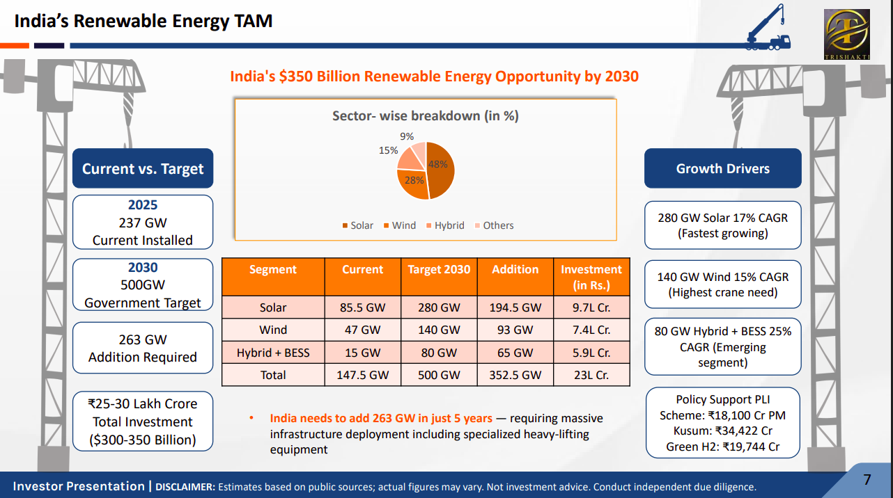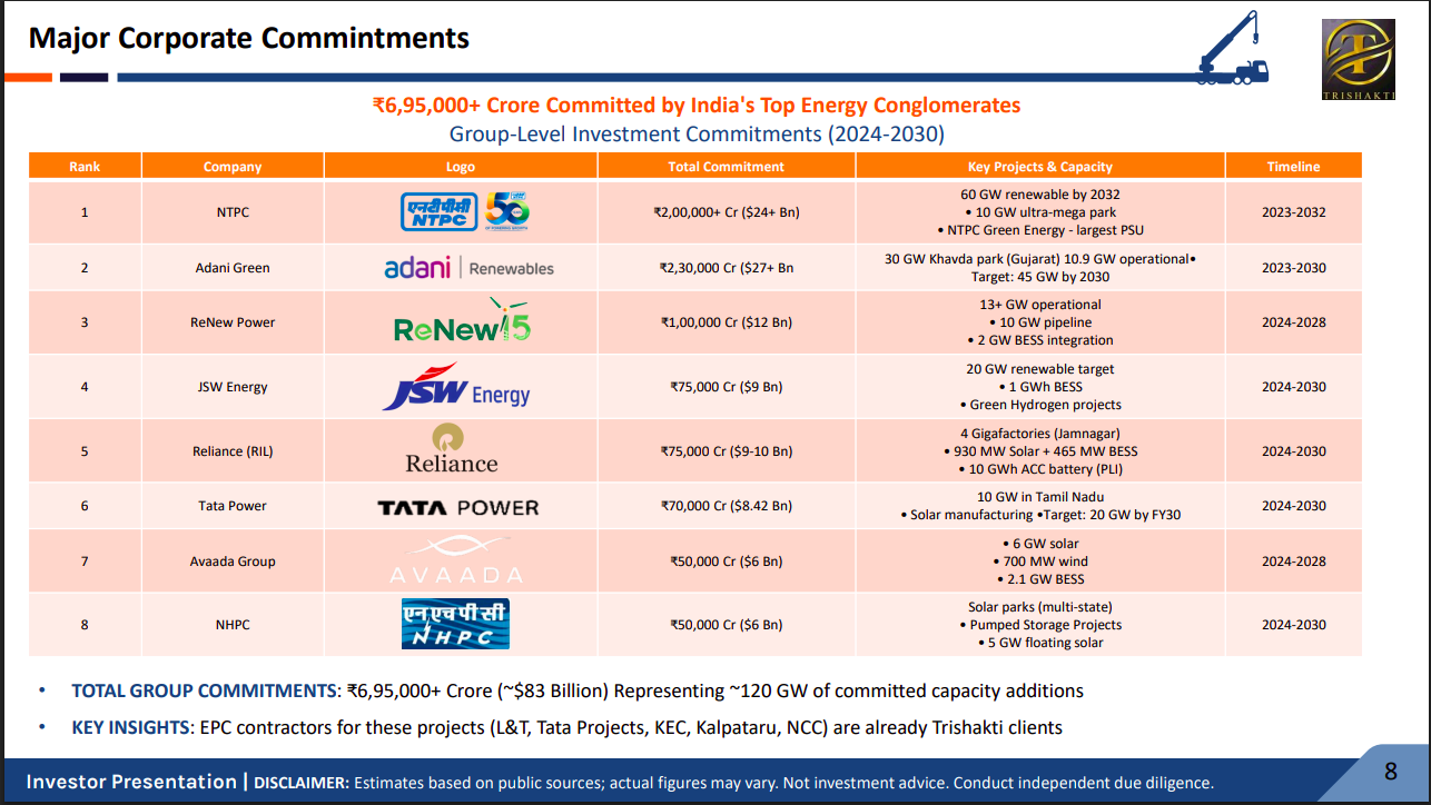 India’s top energy players have committed over ₹6.95 lakh crore (~$83 bn) toward renewable capacity additions through 2030. With EPC partners already in its client base, Trishakti is well positioned to capture execution-linked equipment demand.