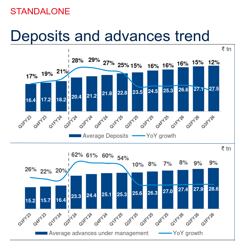 Average deposits and advances maintained a steady upward trajectory through FY25–FY26, though YoY growth moderated from post-merger highs. Deposit growth remained ahead of advances in recent quarters, reflecting balance sheet normalization and liquidity build-up.