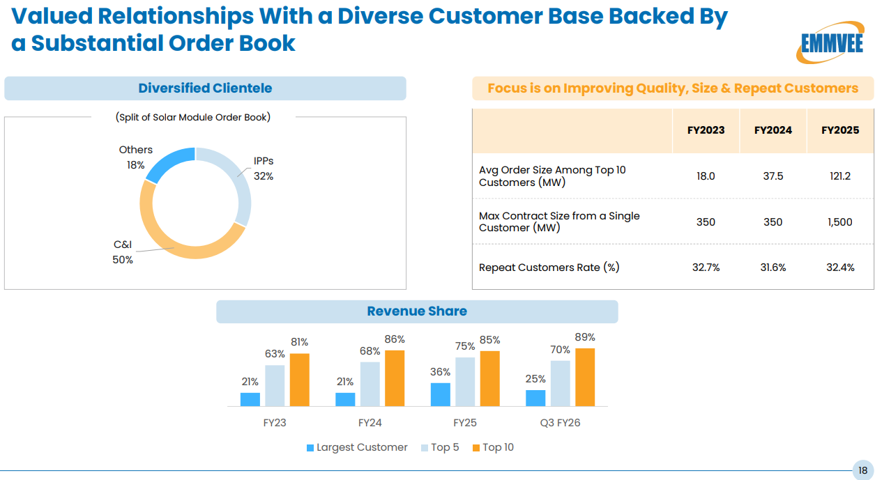 EMMVEE’s solar module order book is well-diversified, with 50% coming from commercial and industrial (C&I) clients, 32% from independent power producers (IPPs), and 18% from others. The company is steadily improving customer quality and retention—average order size among top 10 customers jumped from 18 MW in FY2023 to 121.2 MW in FY2025, while the largest single contract grew from 350 MW to 1,500 MW. Revenue concentration is also reducing, with the top 10 customers now contributing 89% versus 81% in FY2023, and repeat customer rates holding steady around 32%.