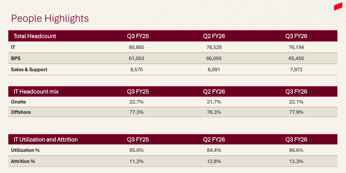Headcount moderated across IT and Sales, while BPS scaled sequentially, reflecting mix optimisation. Offshore share remained stable near ~78%, utilization improved to 86.6%, and attrition stayed elevated but broadly controlled in the low-teens range.