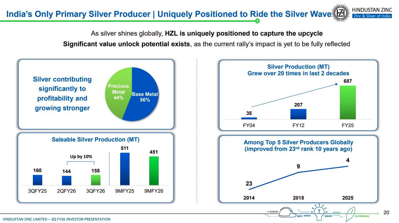 HZL is uniquely positioned to benefit from the global silver upcycle, with silver now contributing 44% of profits. Silver production has grown over 20x in two decades, placing HZL among the top 5 global silver producers with rising scale and profitability.