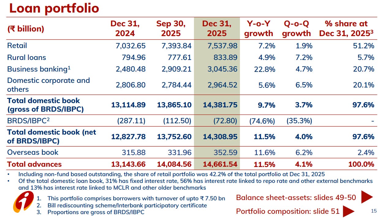 Total advances grew to ₹14.66 trillion as of Dec 31, 2025, delivering 11.5% YoY growth, driven by retail and business banking. The domestic book dominates at 97.6%, while overseas exposure remains limited and controlled.