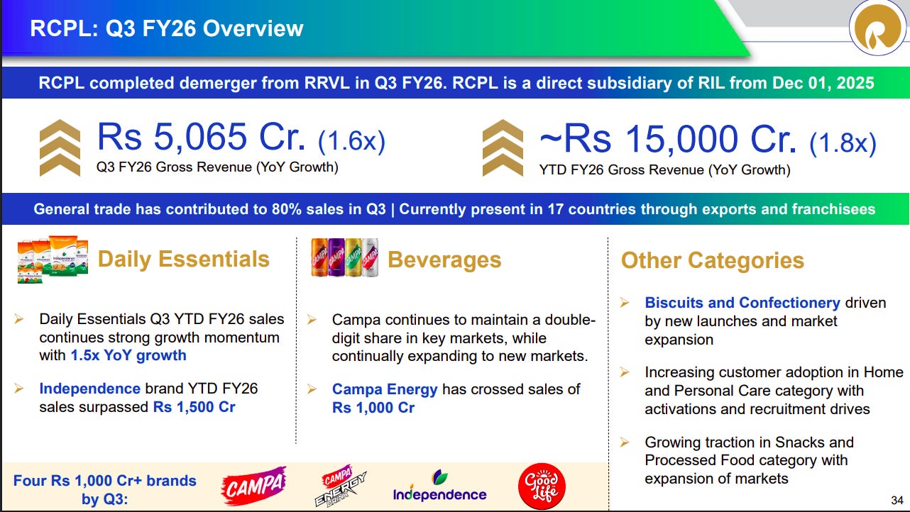 RCPL delivered strong topline momentum in Q3 FY26, with gross revenue of ₹5,065 crore (1.6x YoY) and YTD revenue of ~₹15,000 crore (1.8x YoY). Growth was driven by general trade (80% of sales), daily essentials, and beverages, with multiple brands crossing the ₹1,000 crore milestone.