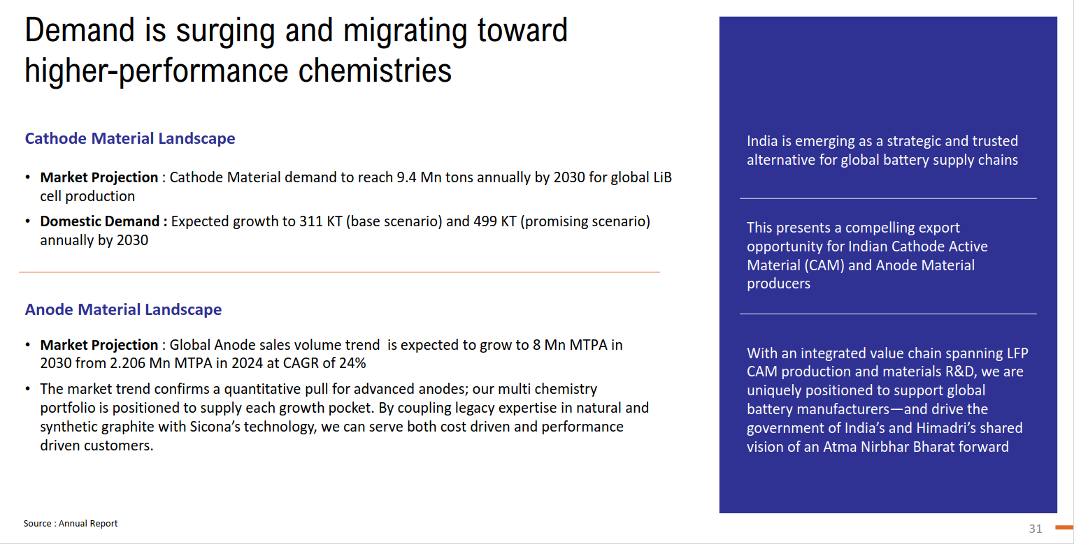 Global cathode and anode material demand is set to rise sharply, driven by accelerating Li-ion battery adoption. India is emerging as a strategic alternative in global battery supply chains, creating export opportunities for CAM and anode material producers.
