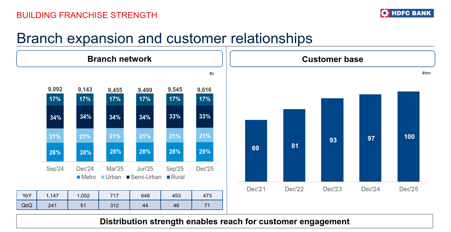 HDFC Bank continued steady branch expansion, taking the network to 9,616 branches by Dec’25, with a consistent mix across metro, urban, semi-urban, and rural locations. The customer base scaled to 100 million, underlining strong franchise reach and deepening customer relationships.