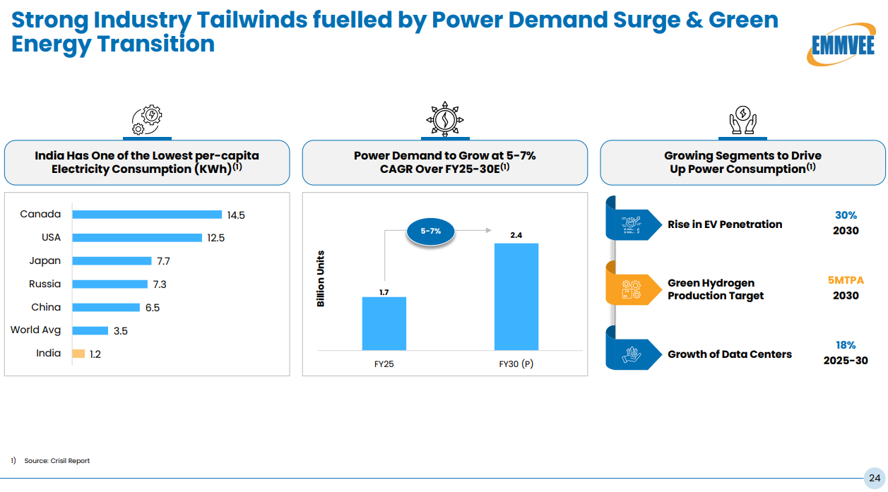 India has one of the lowest per-capita electricity consumption rates globally at just 1.2 kWh, far below the world average of 3.5 kWh, signaling significant room for growth. Power demand is expected to grow at 5-7% annually from FY25 to FY30, driven by rising EV penetration (targeting 30% by 2030), green hydrogen production (5 MTPA target by 2030), and data center growth (18% CAGR from 2025-30). This surge in electricity needs, combined with India’s green energy transition, sets up strong tailwinds for the solar and power infrastructure sector.
