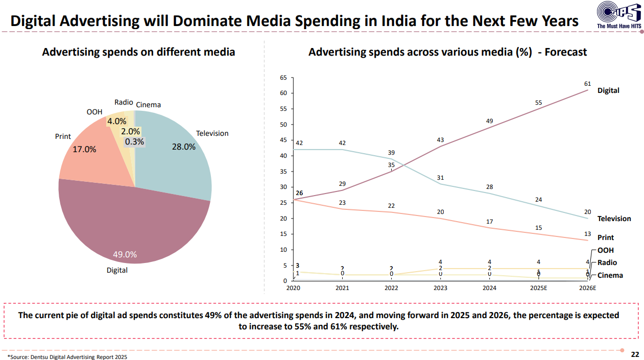 Digital advertising already commands 49% of total media spending in India and is set to grow rapidly, reaching 55% by 2025 and 61% by 2026. Television’s share, meanwhile, is steadily declining from 42% in 2020 to a projected 20% by 2026, with print also shrinking from 26% to 13% over the same period. The shift is clear: digital is becoming the dominant force in India’s advertising landscape, driven by changing consumer behavior and platform growth.