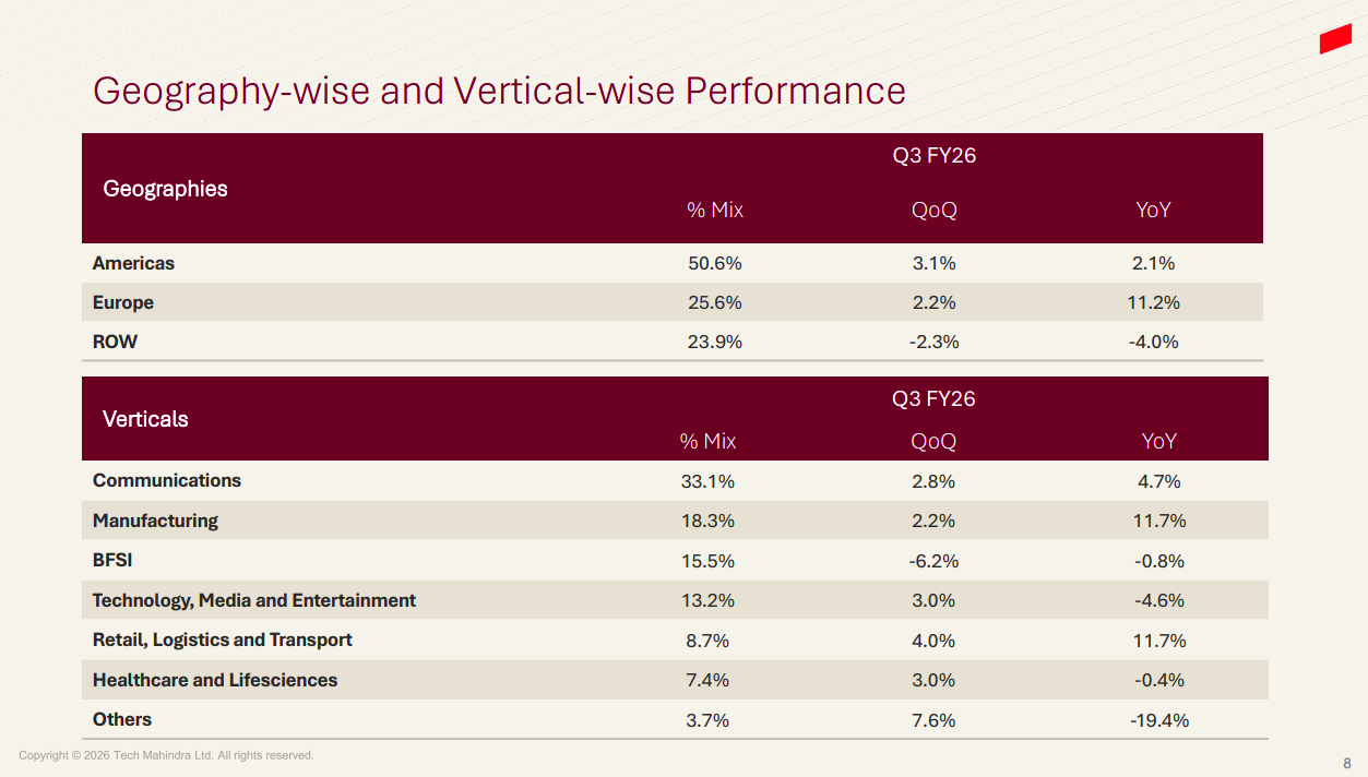 The Americas remained the largest market with steady QoQ and YoY growth, while Europe delivered strong YoY performance. Vertically, Communications and Manufacturing drove growth, Retail & Logistics showed resilience, while BFSI and TME continued to face pressure.