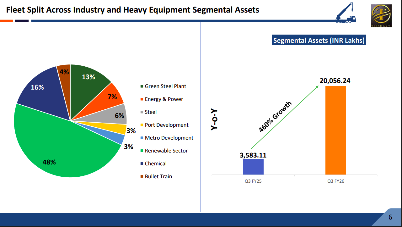 The fleet is heavily skewed toward the renewable sector, which now accounts for nearly half of deployed assets, reflecting strong energy-transition demand. Segmental assets surged ~460% YoY in Q3 FY26, underscoring rapid scale-up and utilization.