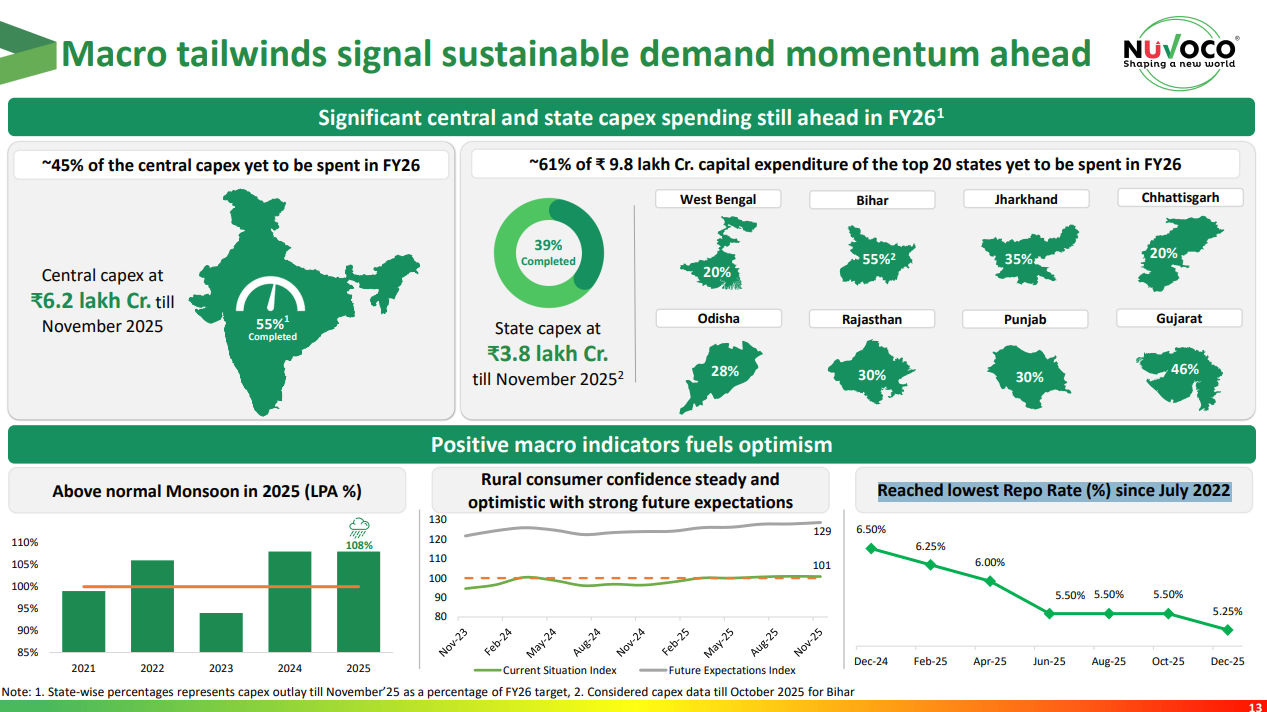 There’s still a lot of government spending in the pipeline—45% of the central capex budget (₹6.2 lakh crore) and 61% of the top 20 states’ capex (₹3.8 lakh crore) remain unspent as of November 2025. The macro picture looks positive: above-normal monsoon in 2025, steady rural consumer confidence with strong future expectations, and repo rates at their lowest since mid-2022 at 5.25%. These factors point to sustained demand for cement in the coming months.