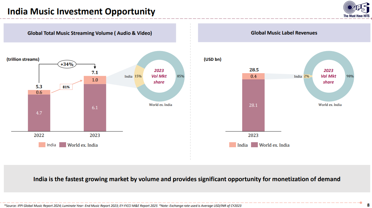 India’s music streaming volume is surging—growing 34% from 5.3 trillion streams in 2022 to 7.1 trillion in 2023, with India accounting for 15% of global volume. However, music label revenues tell a different story: global revenues stood at $28.5 billion in 2023, while India contributed just $0.4 billion, or 2% of the total. This massive gap between consumption and monetization highlights India as the fastest-growing music market by volume, presenting a significant opportunity to convert high engagement into revenue.