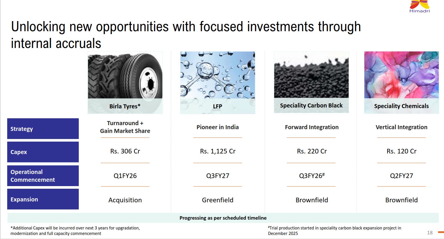 Targeted capex across tyres, LFP, specialty carbon black, and specialty chemicals is aimed at market share gains and forward integration. Investments span greenfield, brownfield, and acquisition routes with staggered operational timelines.