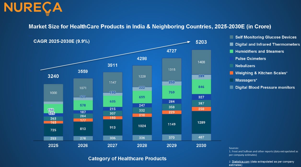 The healthcare products market in India and neighboring countries is set to grow at a healthy 9.9% CAGR, expanding from ₹3,240 crore in 2025 to ₹5,203 crore by 2030. Digital blood pressure monitors dominate the market and are expected to grow from ₹725 crore to ₹1,289 crore over this period. Other fast-growing segments include humidifiers and steamers, nebulizers, and self-monitoring glucose devices, reflecting rising health awareness and demand for at-home monitoring solutions.