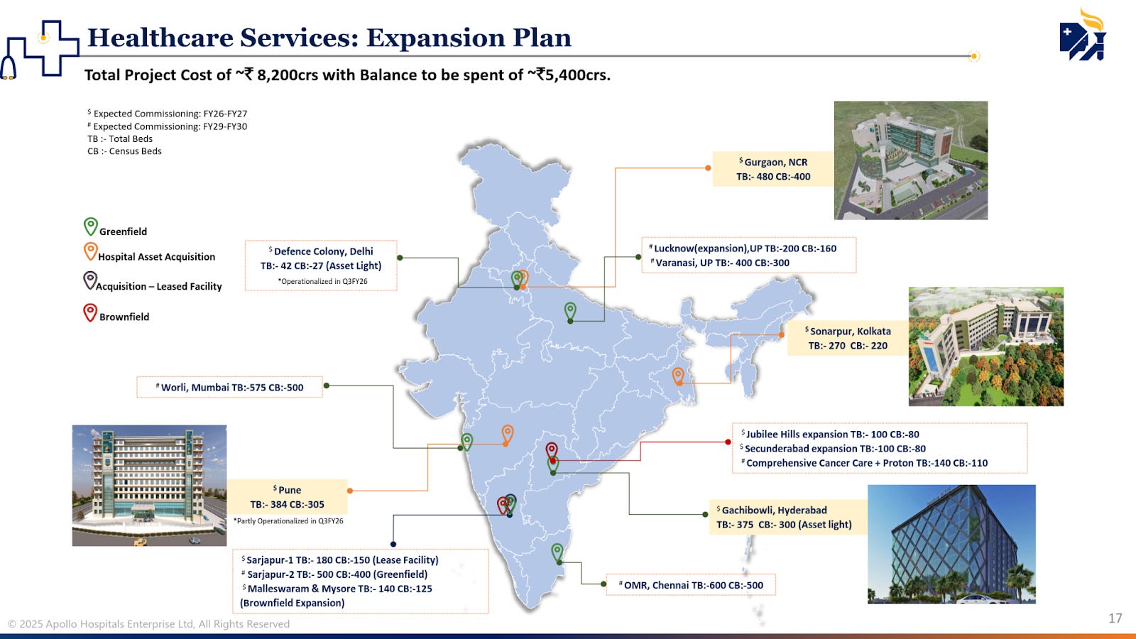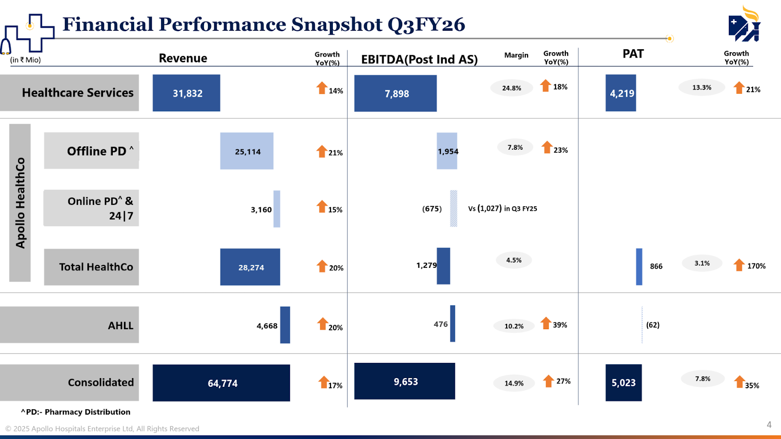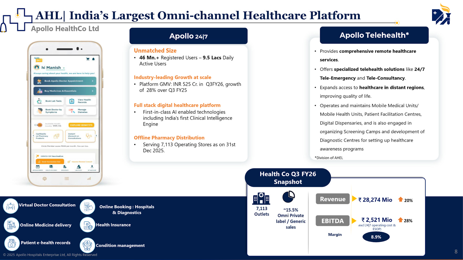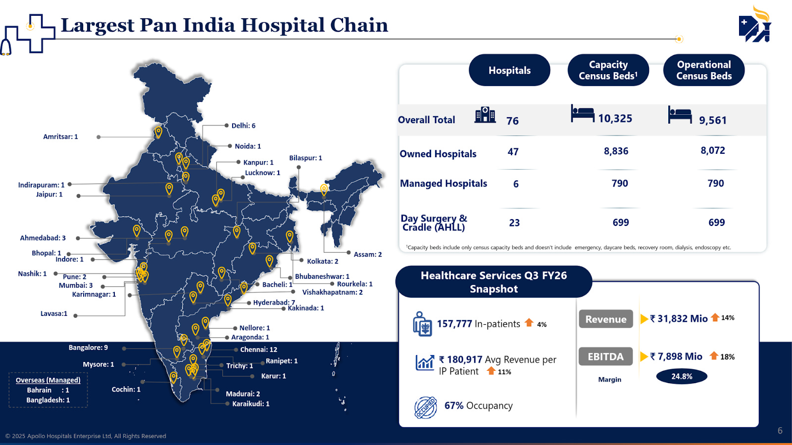 Apollo Hospitals is India’s leading integrated healthcare provider, operating a vast network of multi-speciality hospitals, pharmacies, and primary care clinics. The company combines physical infrastructure with a large-scale digital health platform to offer comprehensive clinical services across the country.