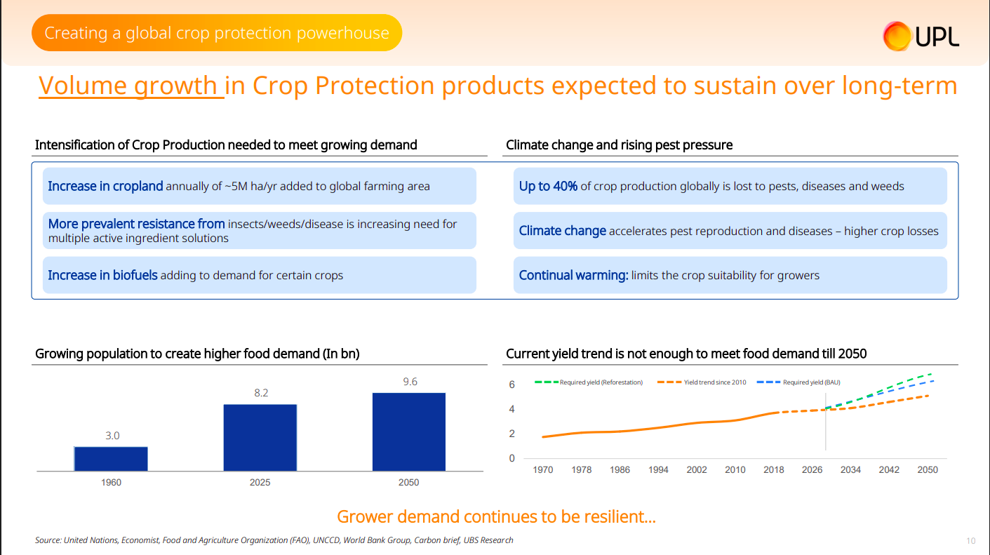 Structural demand drivers such as population growth (9.6bn by 2050), rising pest pressures, climate change, and yield gaps support sustained volume growth in crop protection. Increasing cropland, biofuel demand, and resistance management needs further reinforce long-term resilience in grower demand.