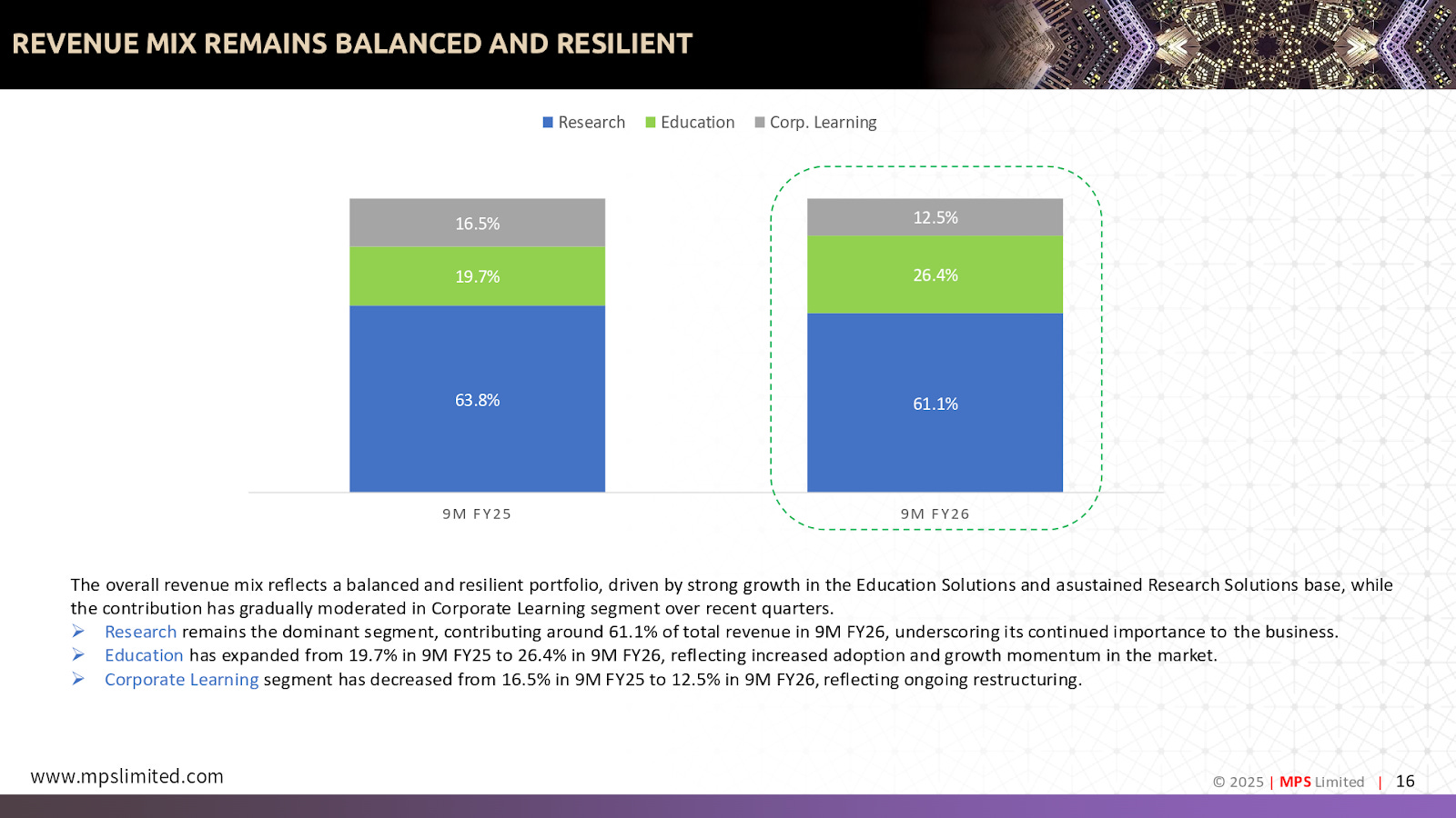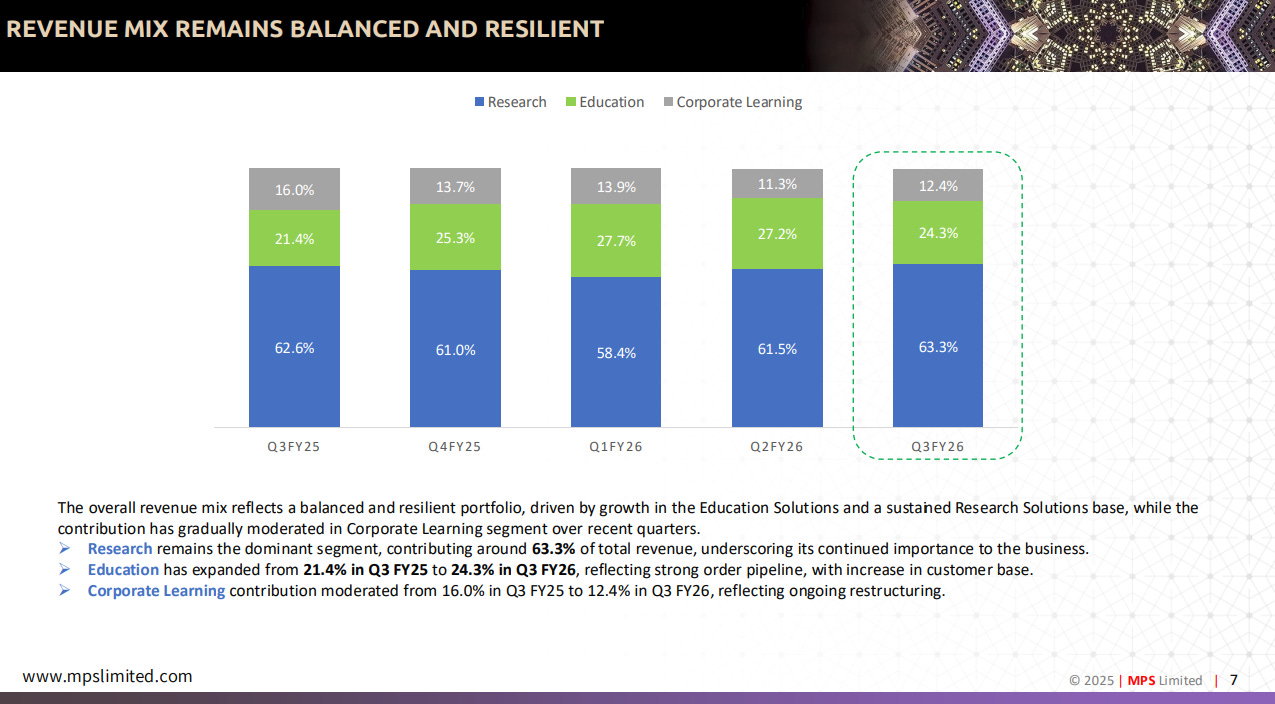 Research remains MPS Limited’s dominant segment at 63.3% of revenue in Q3 FY26, holding steady over the last five quarters. Education has been the growth story, expanding from 21.4% to 24.3% over the same period on the back of a strong order pipeline. Corporate Learning, meanwhile, has moderated from 16% to 12.4% due to ongoing restructuring.