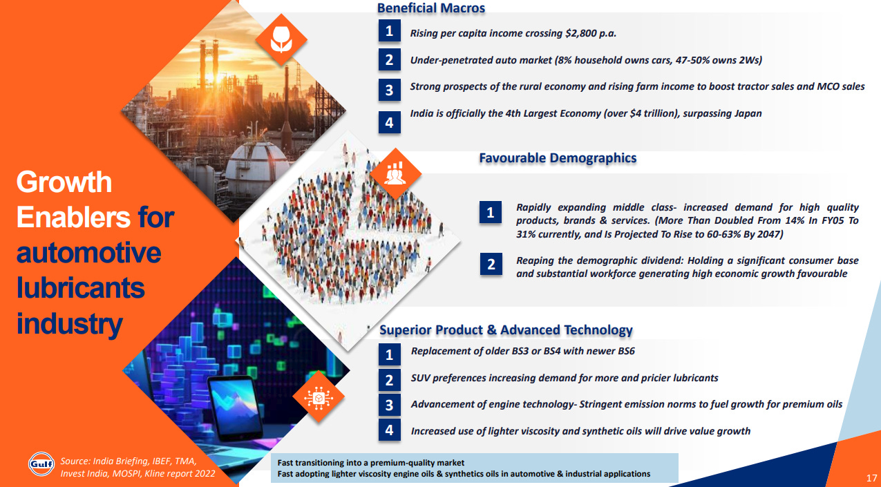 India’s auto market is still deeply under-penetrated with just 8% of households owning cars, and the middle class has more than doubled from 14% in FY05 to 31% now, projected to hit 60-63% by 2047. On top of that, the shift from older BS3/BS4 vehicles to BS6, growing SUV preferences, and stricter emission norms are all pushing demand toward pricier, premium lubricants. The market is quickly transitioning from volume to value.