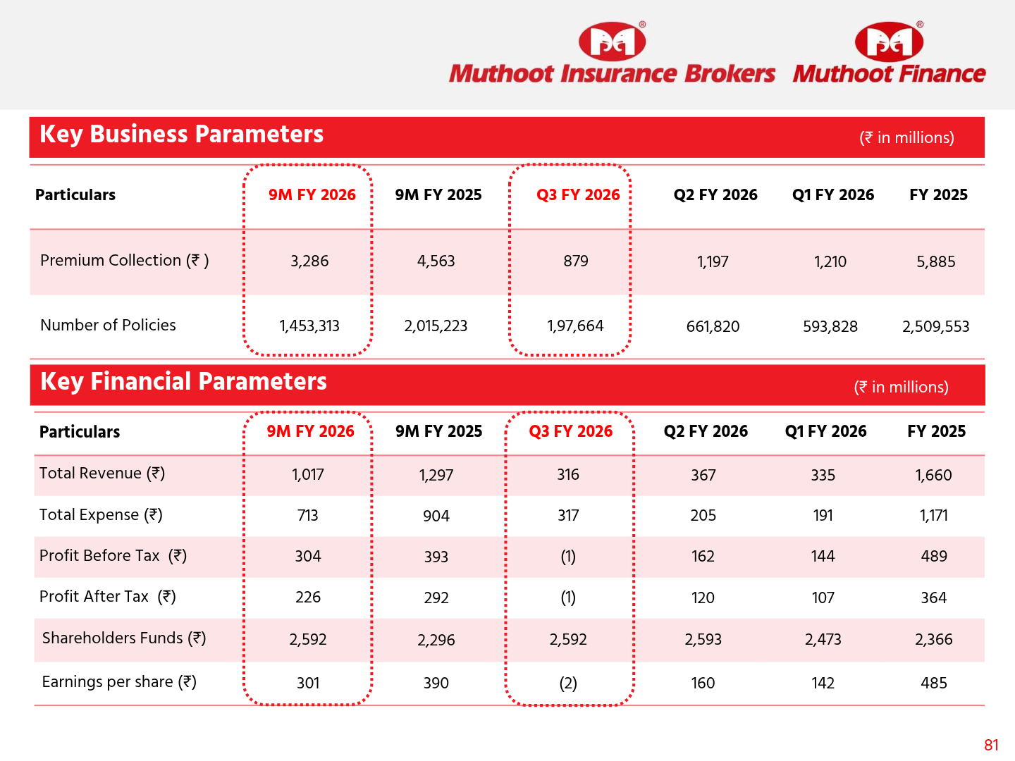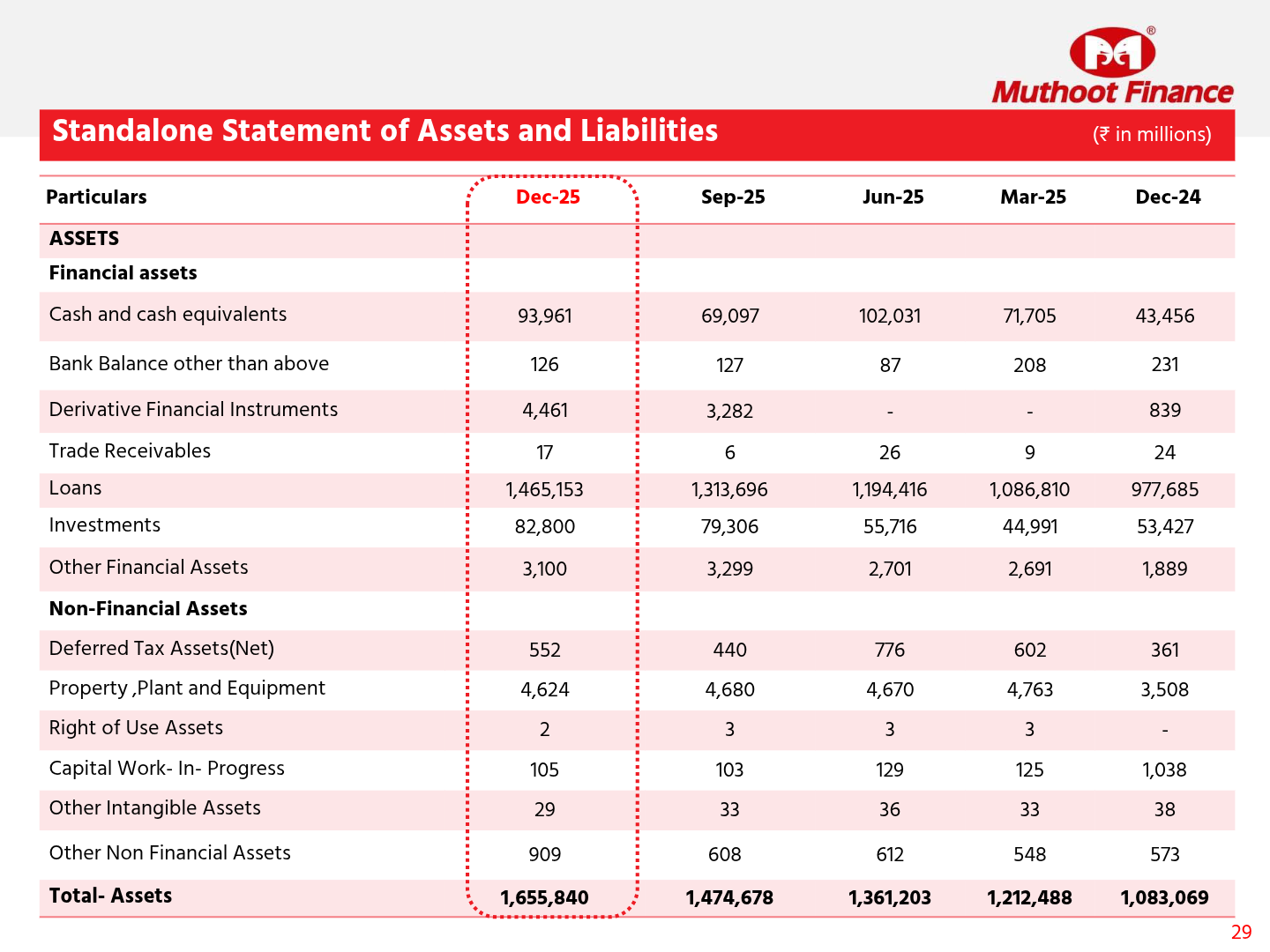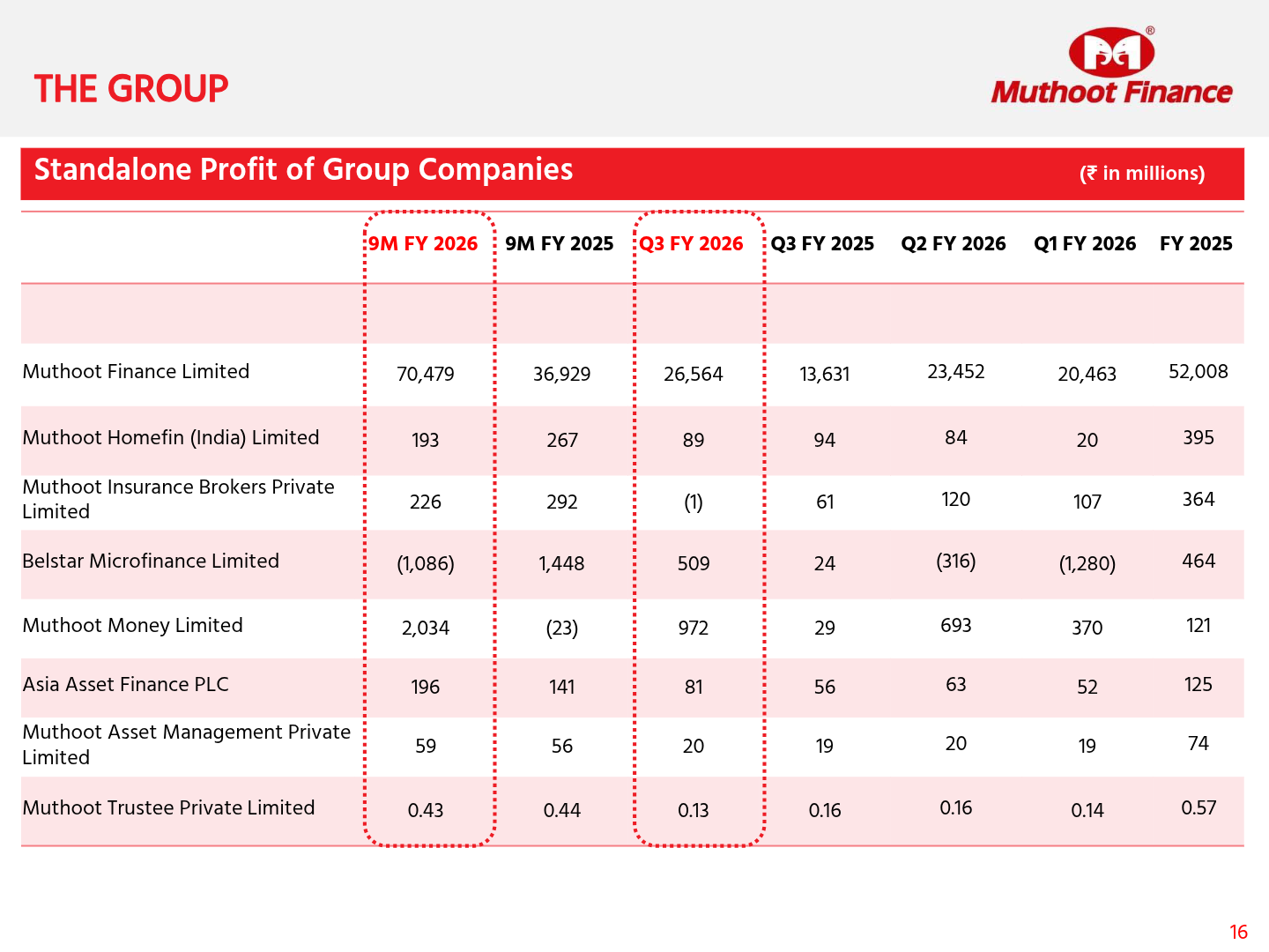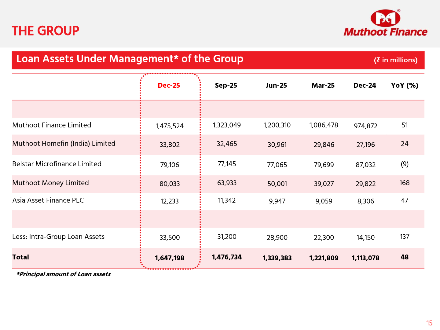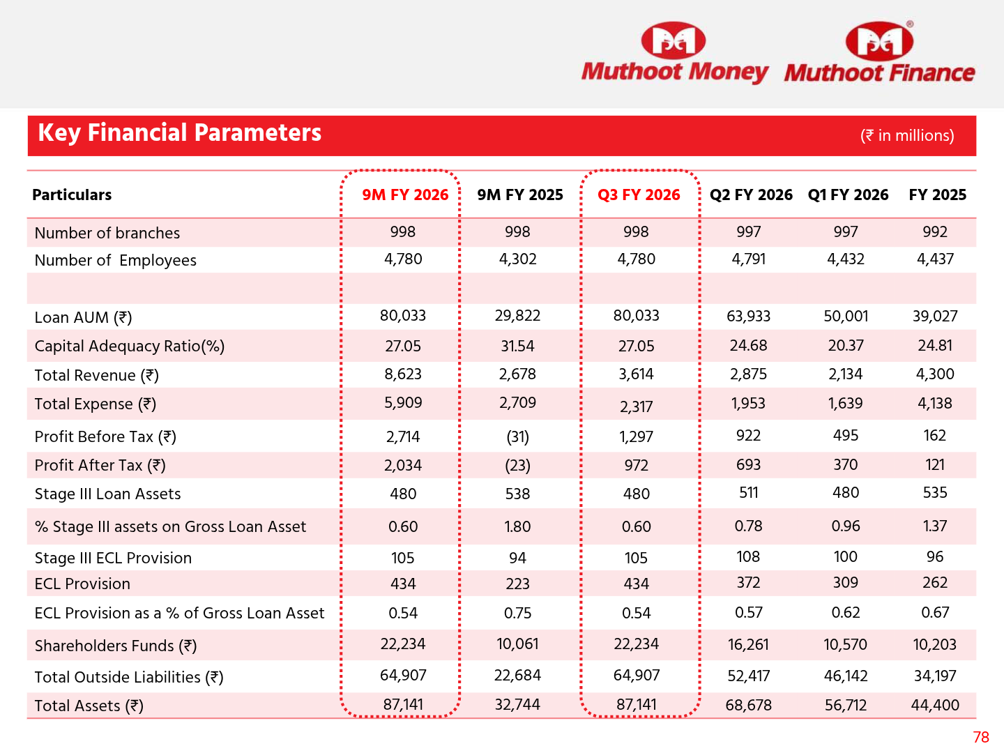 Muthoot Money has achieved a massive turnaround, growing AUM by over 100% year-on-year while simultaneously slashing the Stage III ratio from 1.37% to 0.60%. This scale-up indicates that the subsidiary is now a meaningful contributor to group profitability and has successfully stabilized its credit underwriting processes.