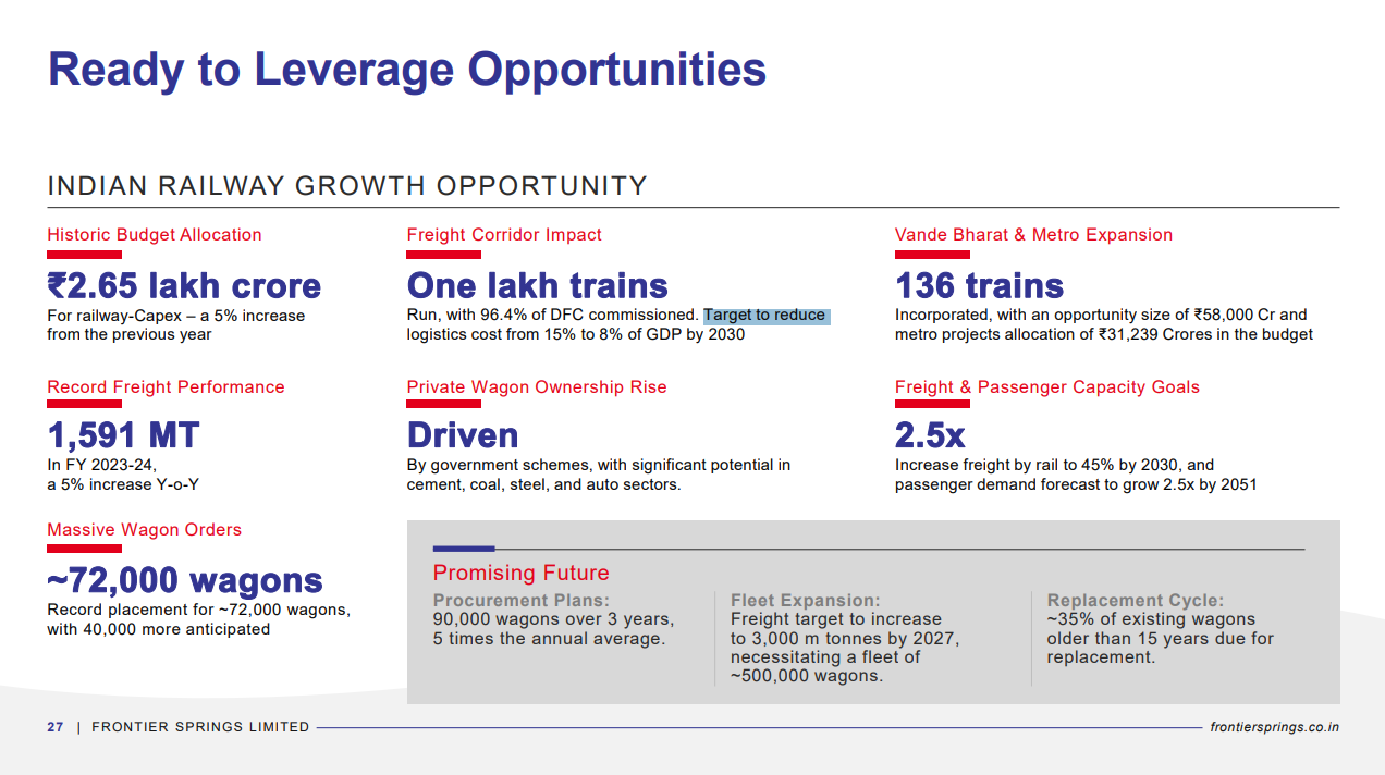 Railway capex stands at ₹2.65 lakh crore (up 5% YoY), with record wagon orders of ~72,000 and another 40,000 anticipated, plus a procurement plan of 90,000 wagons over the next 3 years. The freight target is to hit 3,000 MT by 2027 requiring a fleet of ~500,000 wagons, and ~35% of existing wagons are already over 15 years old and due for replacement. For Frontier Springs, this combination of new orders and replacement demand creates a strong growth runway.