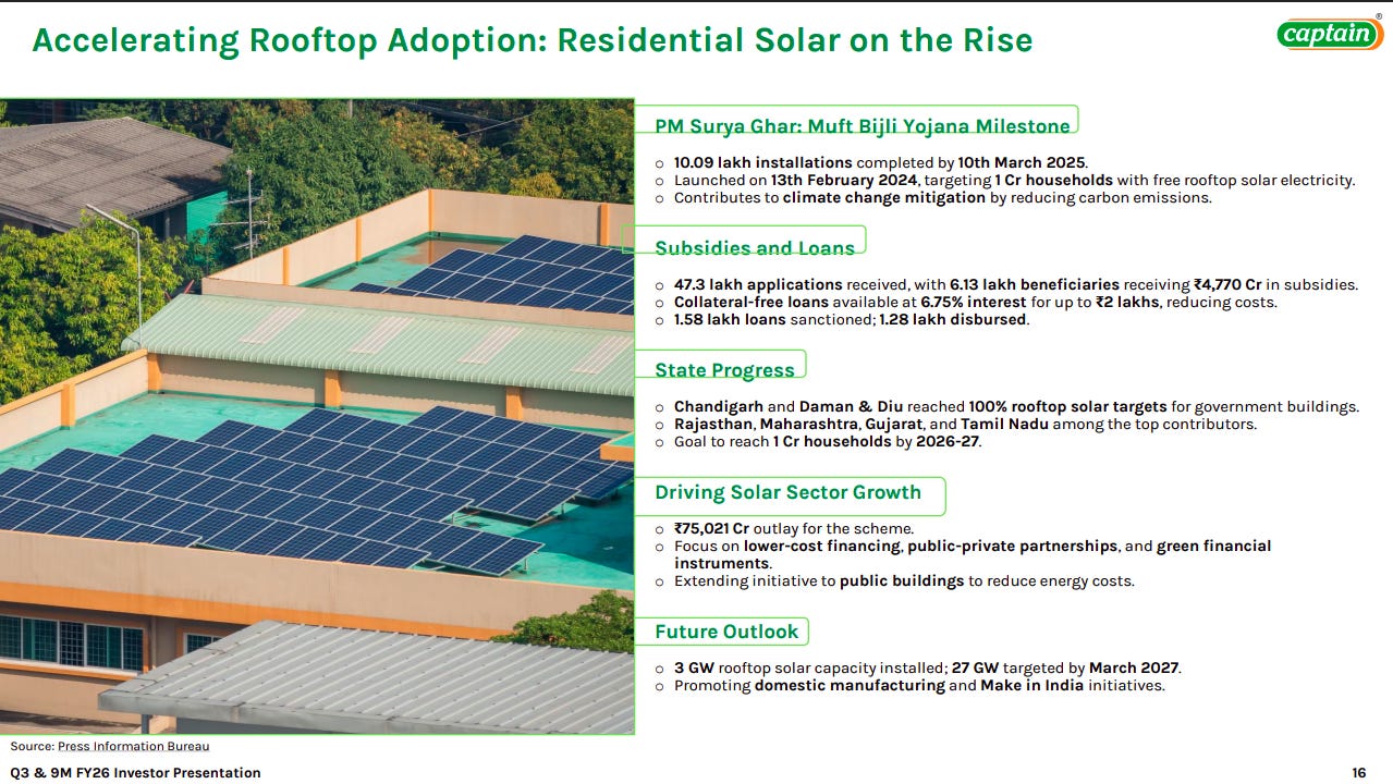 Under PM Surya Ghar, rooftop solar adoption is scaling rapidly with over 10 lakh installations and strong subsidy-backed financing support. With a 27 GW target by March 2027 and focus on domestic manufacturing, rooftop solar is emerging as a key driver of distributed renewable growth.
