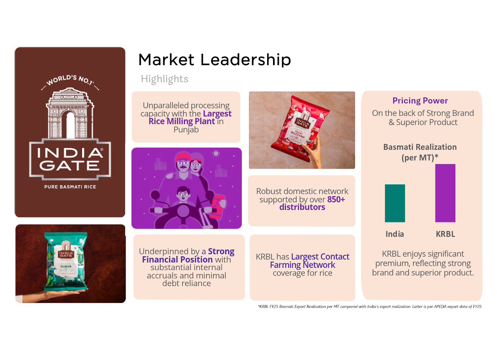 KRBL operates the largest rice milling plant in Punjab, has 850+ distributors across India, and runs the largest contact farming network for rice. The India Gate brand commands a significant premium over the industry average on basmati export realization per MT, reflecting strong pricing power. All of this is backed by a strong financial position with substantial internal accruals and minimal debt.
