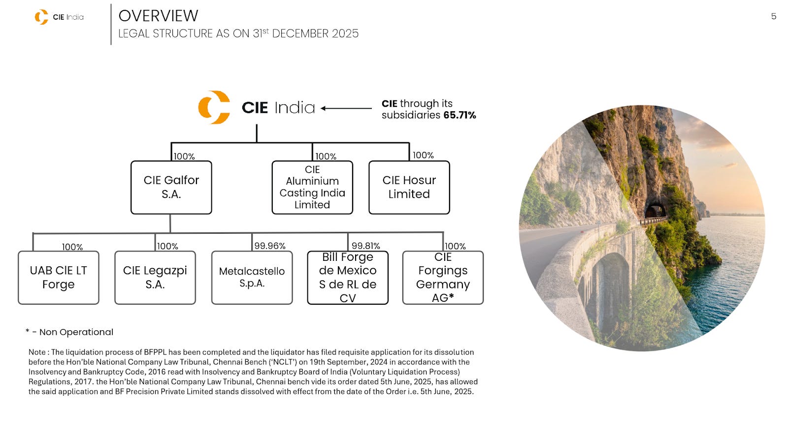CIE Automotive India is a diversified global auto-component manufacturer specializing in forging, casting, and stamping for major vehicle segments. The company maintains a strong geographic footprint in India and Europe, serving leading OEMs across passenger and commercial vehicle platforms.