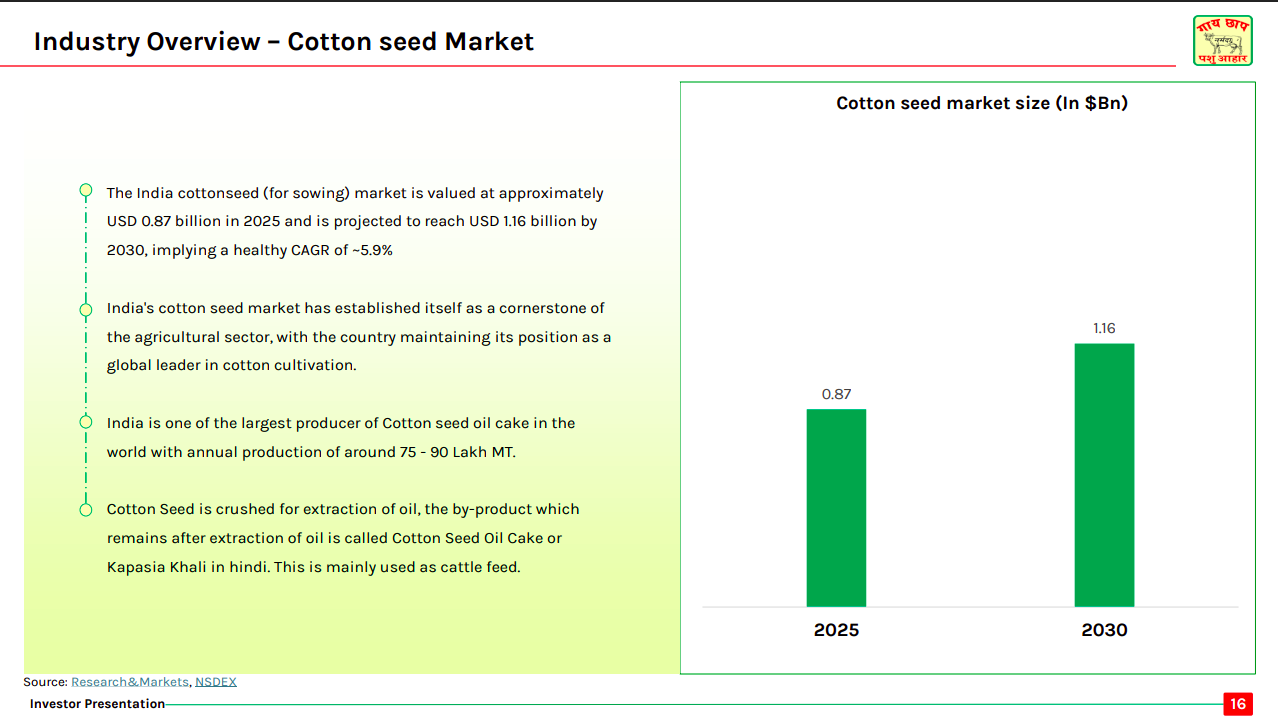 India’s cotton seed market is valued at ~$0.87Bn in 2025 and is projected to reach ~$1.16Bn by 2030, implying ~5.9% CAGR. India remains a global leader in cotton cultivation, with significant cottonseed oil cake production used primarily as cattle feed.