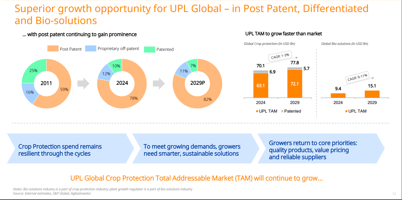 The crop protection mix is increasingly shifting toward post-patent products (59% in 2011 to 82% by 2029P). UPL’s total addressable market (TAM) is expected to grow steadily, with bio-solutions expanding faster (9–11% CAGR) than the broader crop protection market.