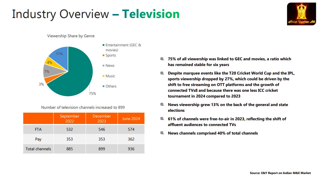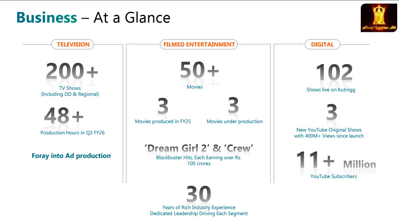 The company has a diversified presence across Television (200+ shows), Filmed Entertainment (50+ movies), and Digital (102 shows live). With 30 years of industry experience, it has delivered blockbuster hits and built a strong digital footprint with 11+ million YouTube subscribers.