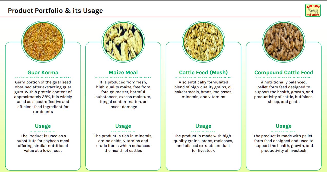 The company offers diversified feed products including Guar Korma, Maize Meal, Cattle Feed (Mesh), and Compound Cattle Feed. These products provide high-protein, mineral-rich, and nutritionally balanced solutions to enhance livestock health, growth, and productivity.