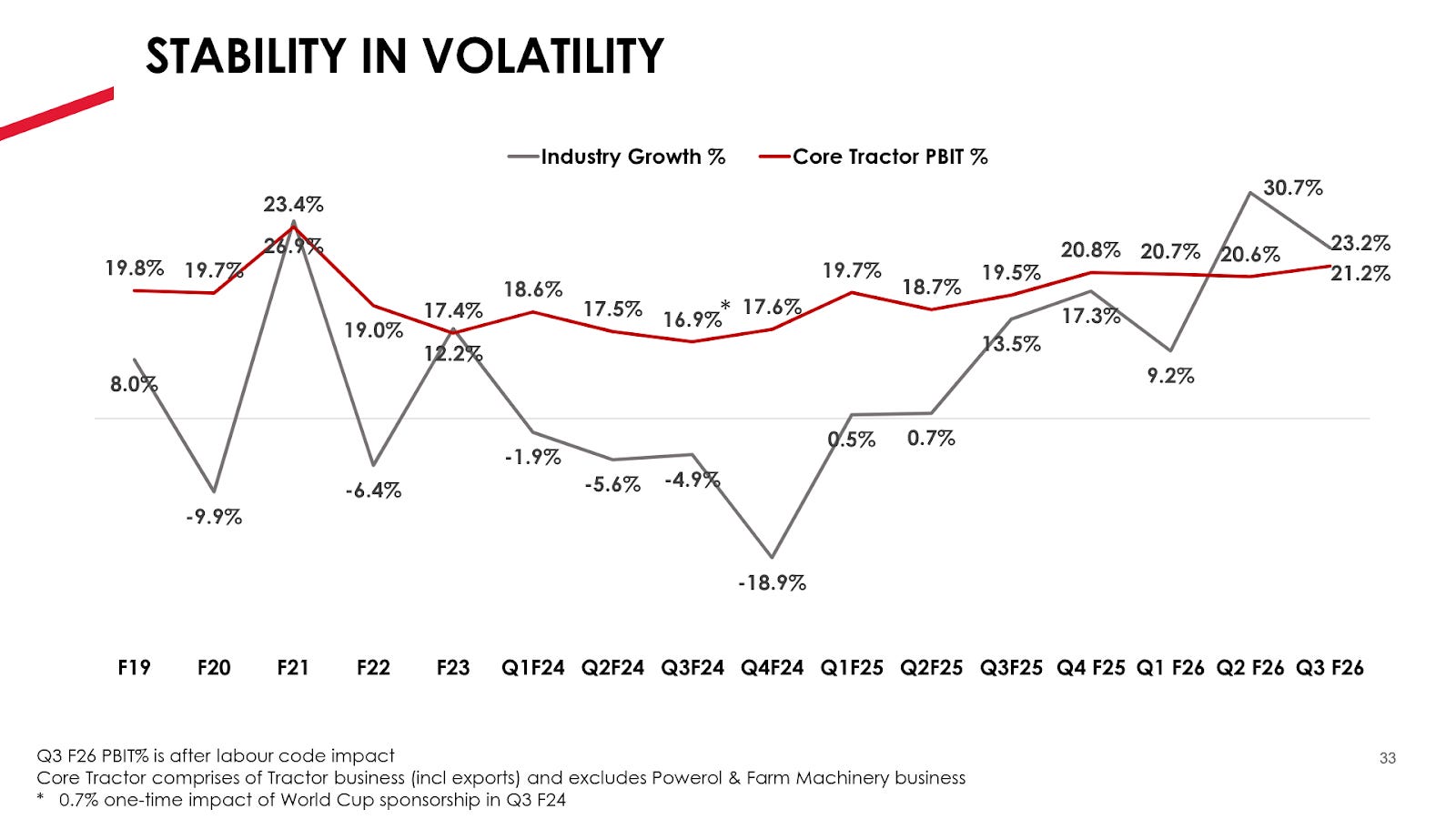 A massive 31.5% surge in tractor production during the final quarter indicates a strong rural recovery and potential inventory restocking. This sharp inflection point suggests that the cyclical bottom in the farm equipment segment is likely behind us and will drive volume growth in early CY26.