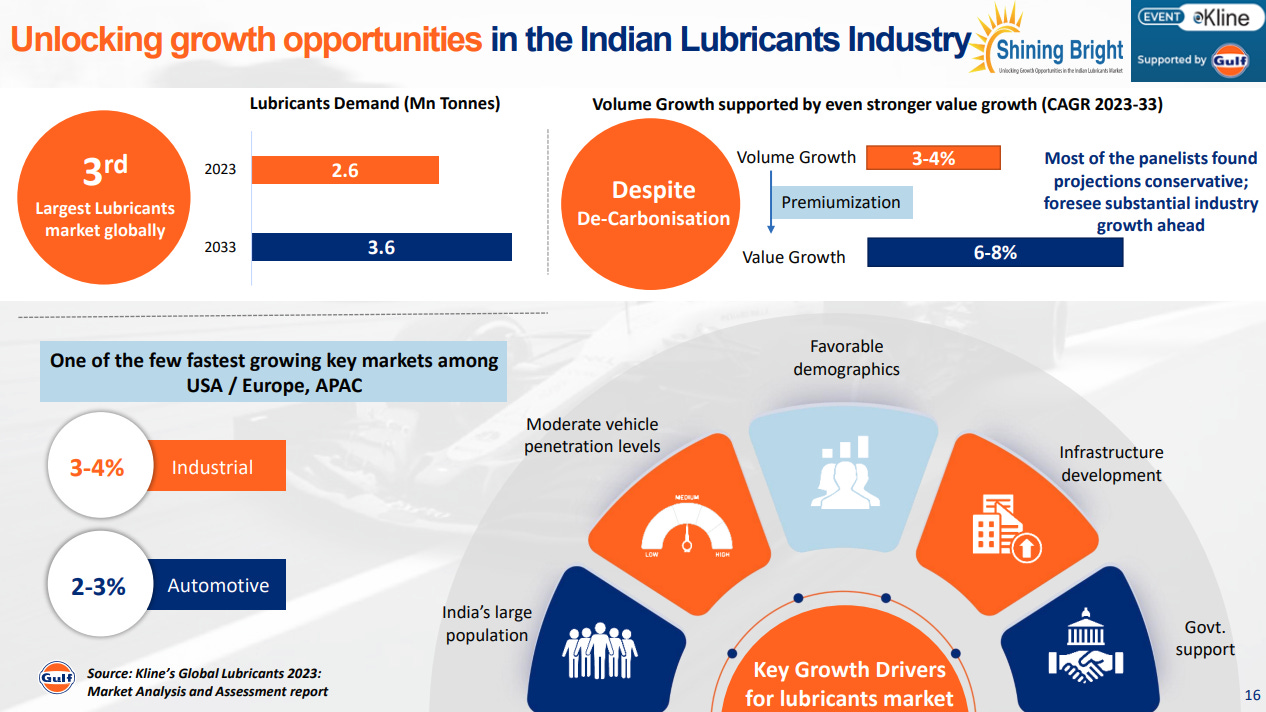 India is the 3rd largest lubricants market globally, with demand expected to grow from 2.6 million tonnes in 2023 to 3.6 million tonnes by 2033. Even with de-carbonisation, volume growth is projected at 3-4% CAGR and value growth at 6-8%, driven by premiumization. Favorable demographics, low vehicle penetration, infrastructure development, and government support make India one of the fastest-growing lubricant markets among the US, Europe, and APAC.