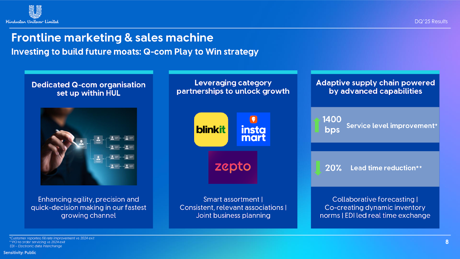 A 1400-basis point improvement in service levels for quick commerce shows a dedicated effort to own the fastest-growing urban channel. By institutionalizing quick-commerce capabilities, the firm protects its market share against digital-first brands while lowering fulfillment lead times by 20%.