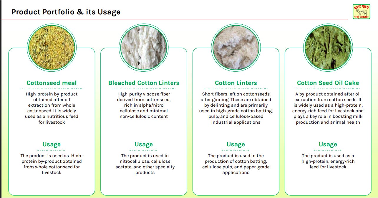 The portfolio includes cottonseed meal, cotton linters, bleached cotton linters, and cottonseed oil cake. While oil cake and meal serve as high-protein livestock feed, linters are used in cellulose, pulp, paper, and specialty industrial applications.