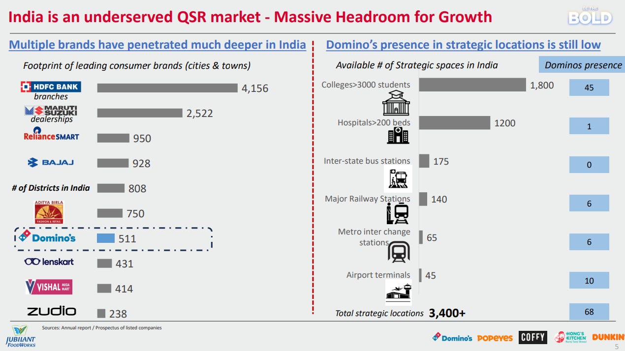 Domino’s is present in just 511 cities and towns, well behind brands like HDFC Bank (4,156) and Maruti Suzuki (2,522) that have gone much deeper into India. There are over 3,400 strategic high-footfall locations across colleges, hospitals, railway stations, and airports, but Domino’s is in only 68 of them. Even within its existing brand, there’s a lot of white space left before it hits any kind of saturation.