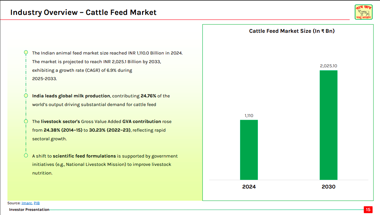 India’s cattle feed market stood at ₹1,110Bn in 2024 and is expected to grow to ₹2,025Bn by 2030+, driven by ~6.9% CAGR. Strong milk production leadership and rising livestock GVA contribution are fueling demand for scientific and nutritionally balanced feed.