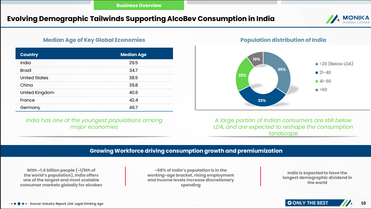 India has one of the youngest populations globally (median age ~29.5), with ~68% in the working-age bracket, supporting long-term consumption growth. A large young demographic below legal drinking age is expected to drive future premiumization and sustained demand expansion.