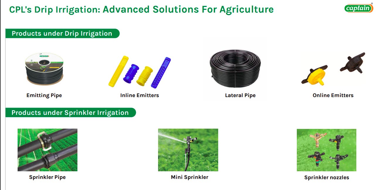 CPL offers a comprehensive portfolio across drip and sprinkler irrigation, including emitting pipes, inline/online emitters, lateral pipes, sprinkler pipes, and mini sprinklers. The diversified product suite positions the company to address water-efficiency needs across varied crop and farm applications.