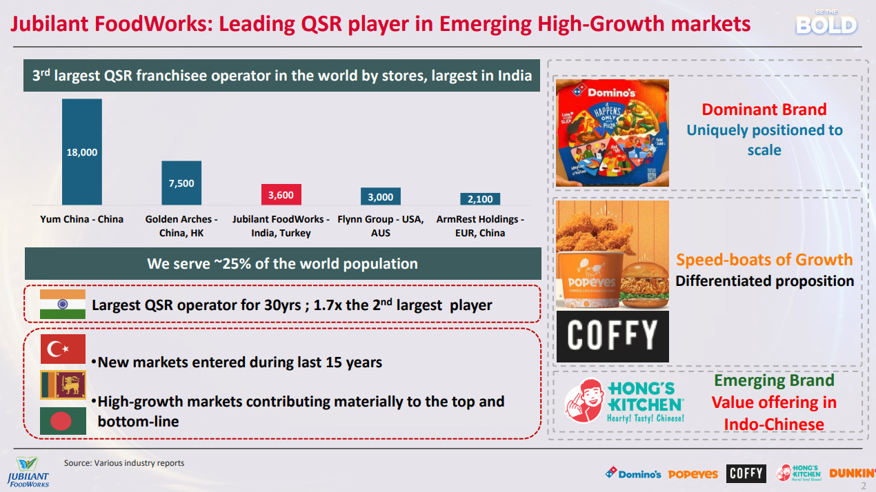 Jubilant FoodWorks is the 3rd largest QSR franchisee operator globally with 3,600 stores, and the largest in India by a wide margin at 1.7x the second-biggest player. It serves roughly 25% of the world’s population across India, Turkey, Bangladesh, and Sri Lanka. Beyond the dominant Domino’s brand, it’s building newer bets like Popeyes, Coffy, and Hong’s Kitchen as independent growth drivers.