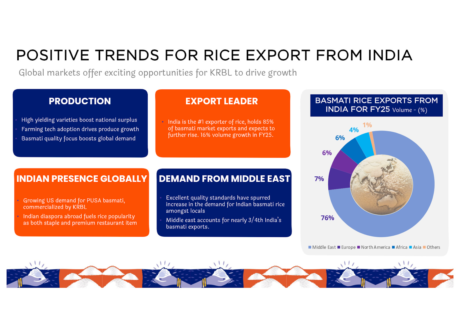 India is the #1 rice exporter globally, holding 85% of the basmati export market with 16% volume growth expected in FY25. The Middle East alone accounts for 76% of India’s basmati exports by volume, with growing demand from the US and Indian diaspora markets adding further tailwinds. For KRBL, as the market leader in basmati, these export trends translate directly into opportunity.