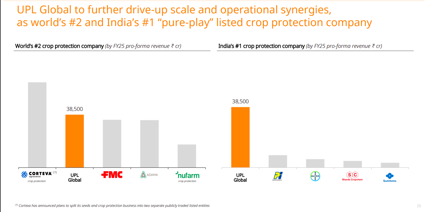 UPL positions itself as the world’s #2 and India’s #1 pure-play listed crop protection company based on FY25 pro-forma revenue (~₹38,500 crore). It ranks alongside global majors and leads the Indian market with significant scale advantages.