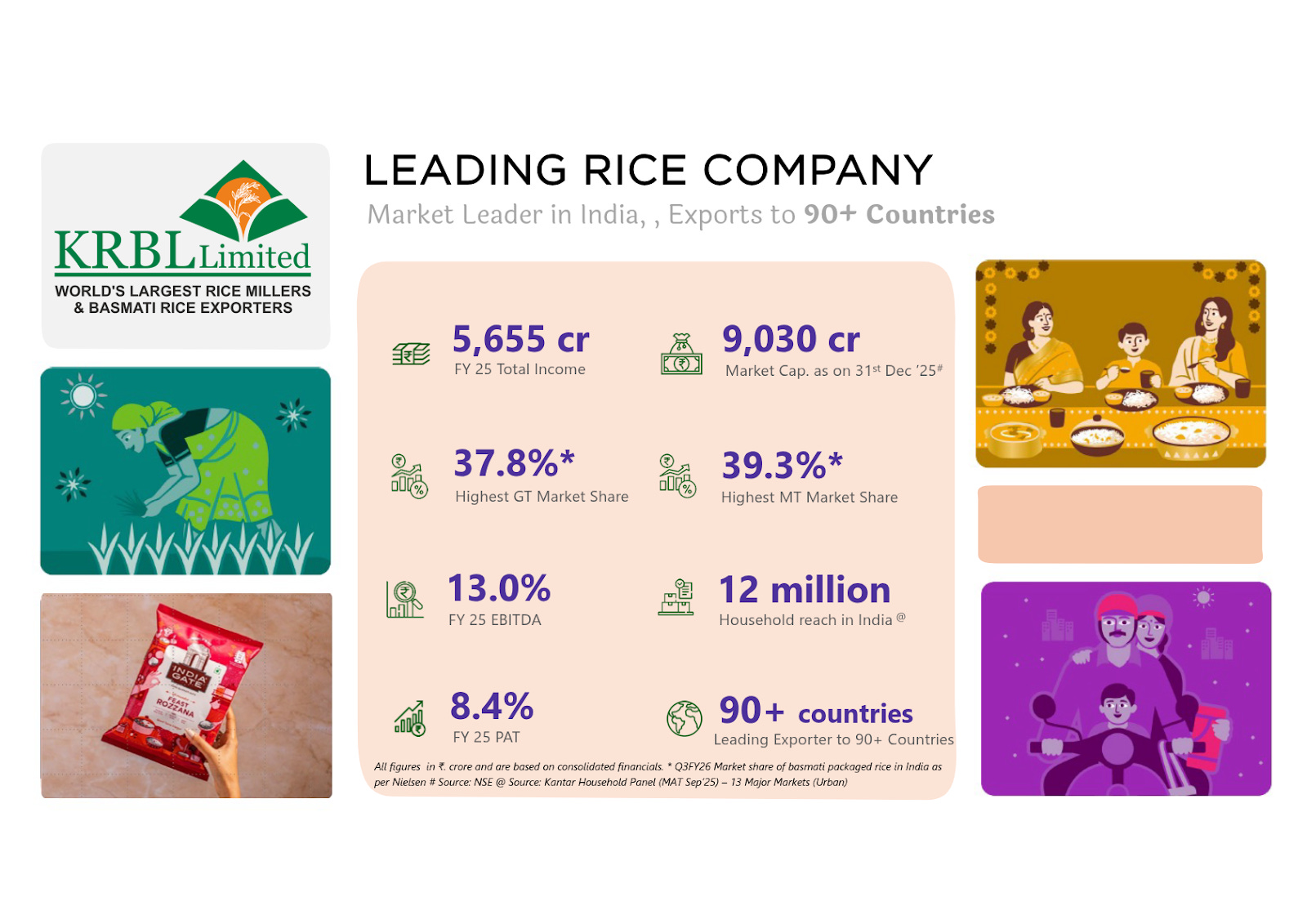 KRBL is the world’s largest rice miller and basmati exporter, with FY25 total income of ₹5,655 crore and a market share of 37.8% in general trade and 39.3% in modern trade. It reaches 12 million households in India and exports to over 90 countries. FY25 EBITDA margin stood at 13% with a PAT margin of 8.4%.