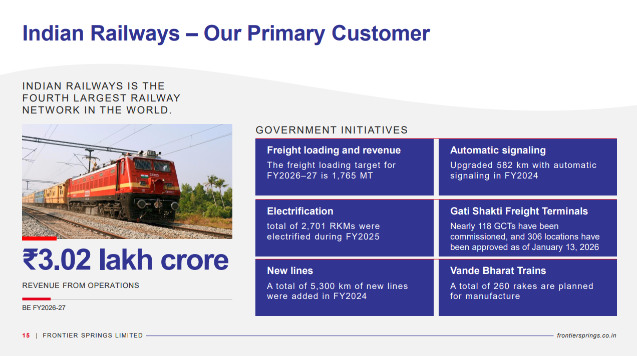 Indian Railways is Frontier Springs’ primary customer, with a budgeted revenue of ₹3.02 lakh crore for FY2026-27 and a freight loading target of 1,765 MT. The government is actively investing in electrification, new lines (5,300 km added in FY24), automatic signaling, Gati Shakti freight terminals, and 260 planned Vande Bharat rakes. For a springs manufacturer tied to railways, all of this translates directly into demand.
