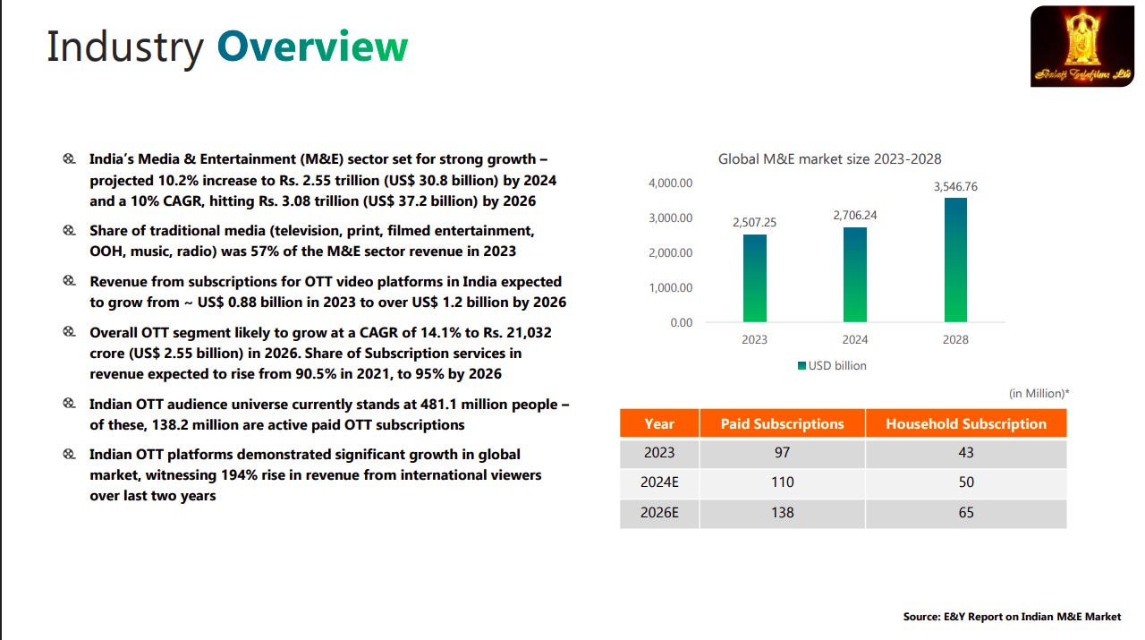 India’s M&E sector is projected to grow at ~10% CAGR, reaching ₹3.08 trillion by 2026, driven by OTT expansion and subscription growth. Paid OTT subscriptions are expected to rise from 97 million in 2023 to 138 million by 2026, with increasing household penetration.